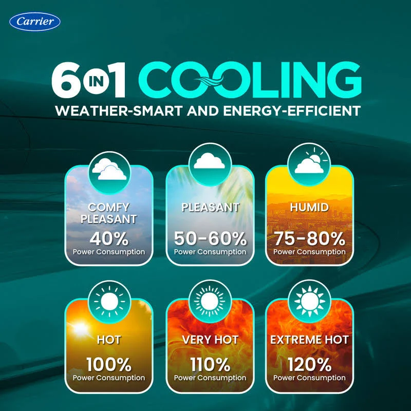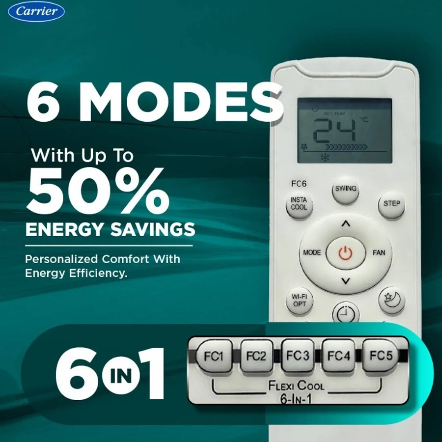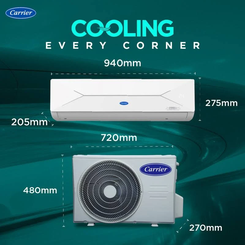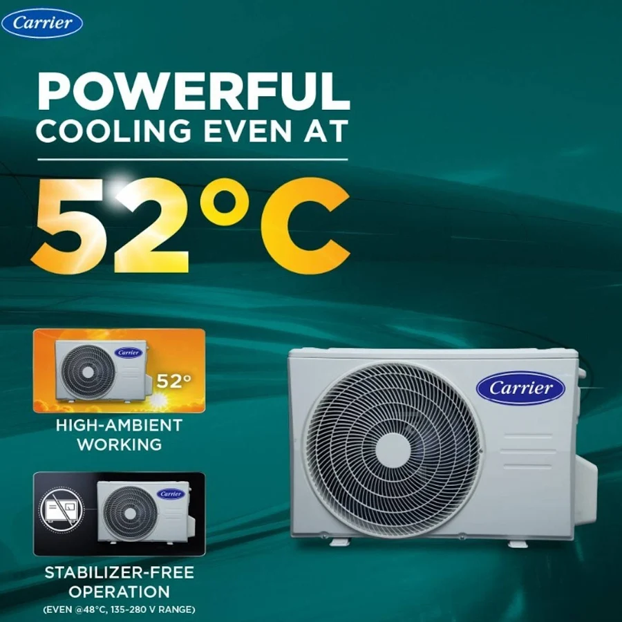 The Carrier 1.5 Ton 3 Star Inverter Split AC is a medium‑capacity cooling system designed for rooms around 110 – 160 sq ft. It uses inverter rotary compressor technology which adjusts cooling power based on room temperature, giving efficient cooling with moderate energy use.