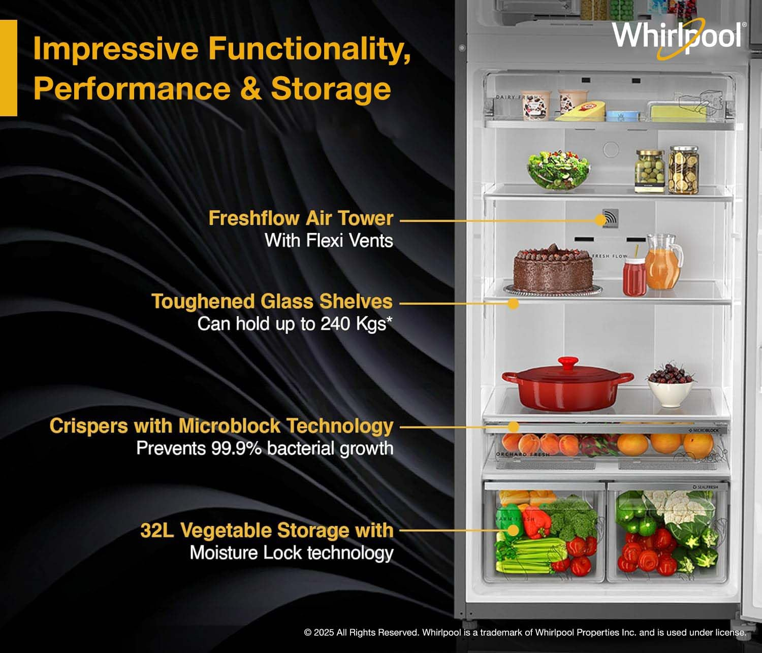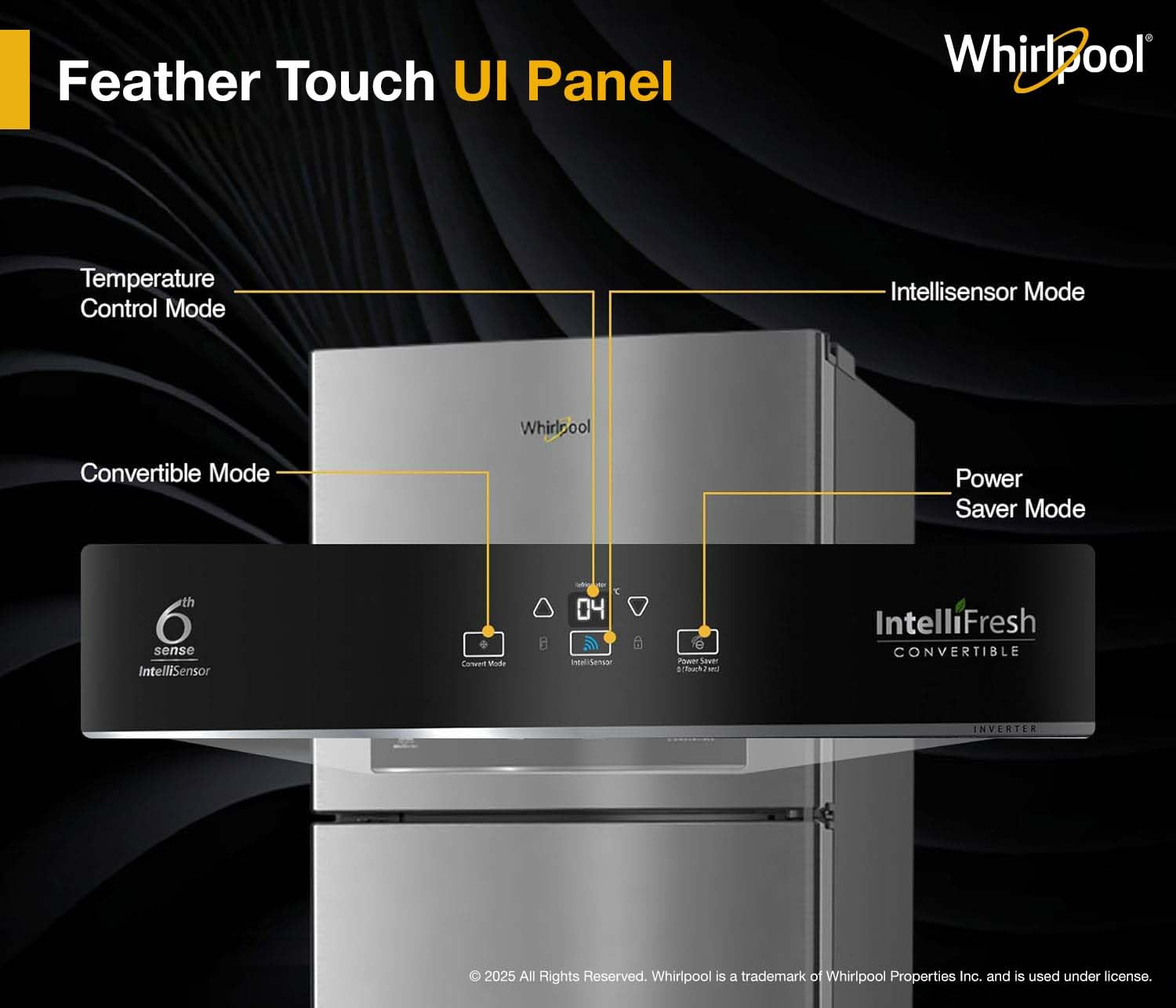 This 467 litre, 2 Star frost‑free double‑door refrigerator is designed for medium to large families (about 4–6 members). It features a smart inverter compressor for quieter and more energy‑efficient cooling. The unit offers 5‑in‑1 convertible cooling modes such as All‑Season, Party, Chef, Dessert and Deep Freeze modes to adjust storage space between the fridge and freezer as needed. It uses 6th Sense AI technology to optimise cooling and maintain freshness, and includes technologies like Freshonizer, Microblock antibacterial protection, and anti‑odor systems to help keep food fresh longer. It operates without an external stabilizer and has frost‑free defrosting to reduce manual maintenance.