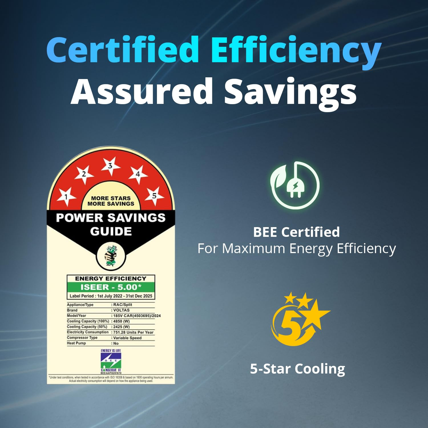 The Voltas 1.5 Ton 5 Star Inverter Split AC is designed for medium-size rooms (about 110–170 sq ft). It uses a BLDC inverter compressor that automatically adjusts its speed based on the room temperature to provide efficient cooling while reducing electricity consumption.
