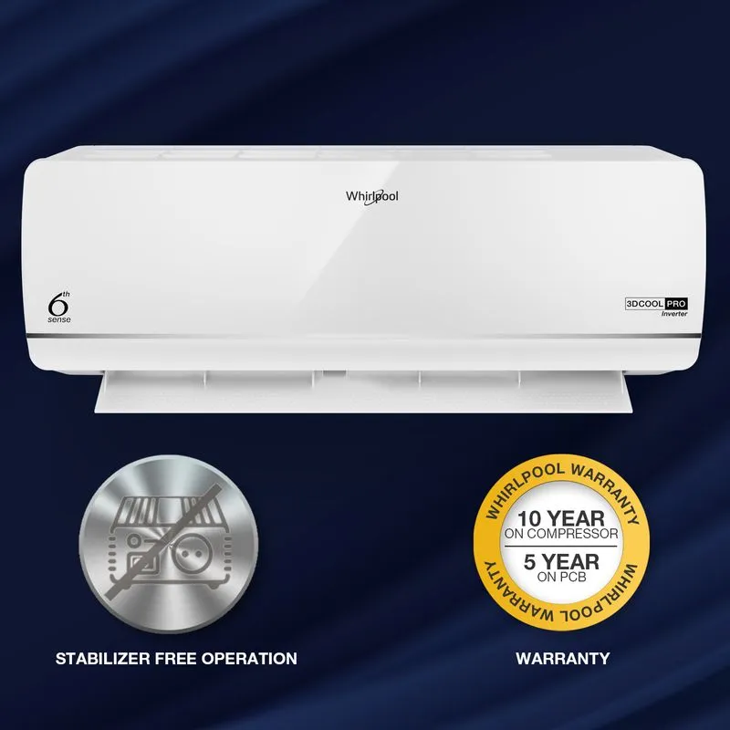 The Whirlpool 1.5 Ton 3D Cool Pro Inverter Split AC (3 Star) is designed for medium-size rooms (120–170 sq ft). It uses inverter technology that automatically adjusts compressor speed to maintain temperature and save electricity.
