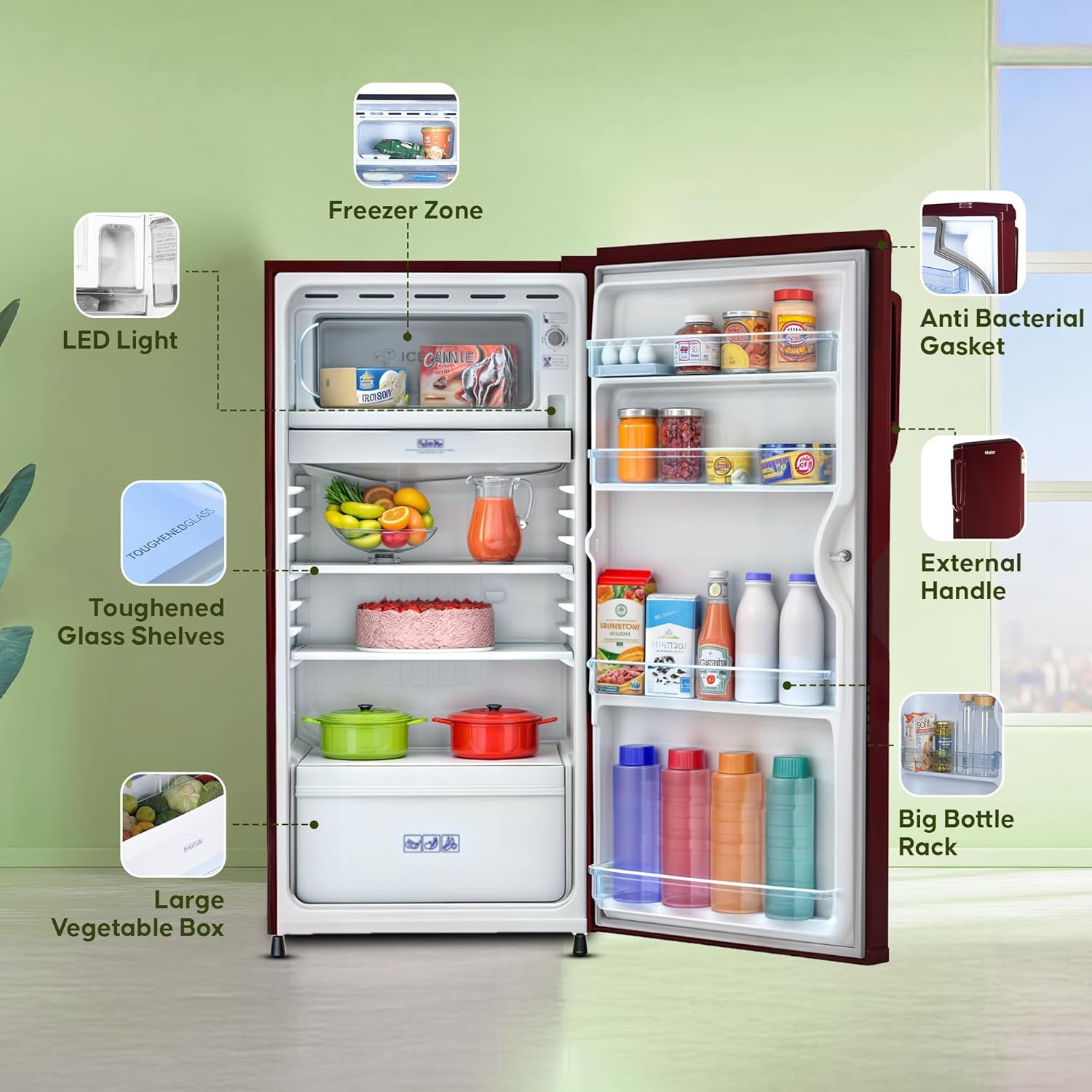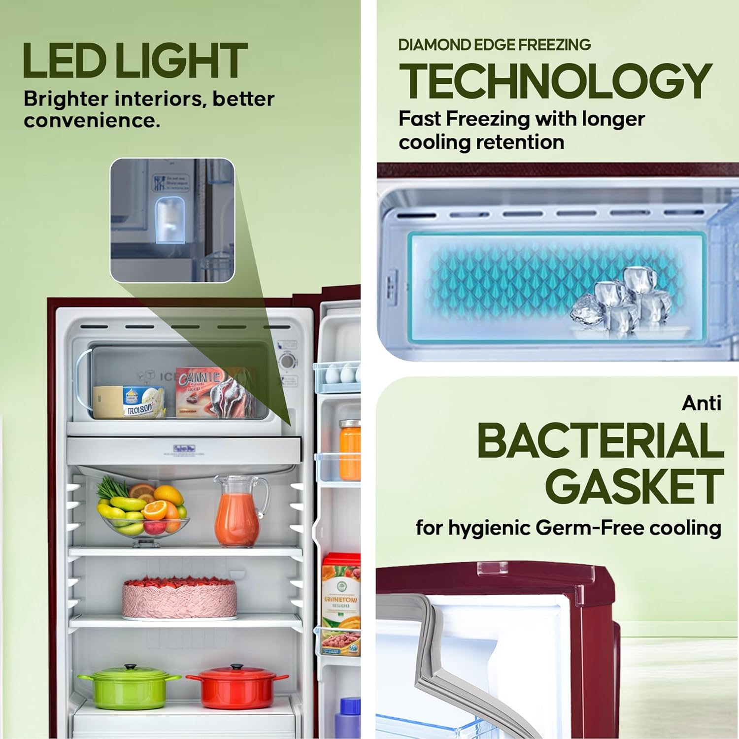 Capacity 175 litres Ideal for bachelors, couples, or small families. Good for daily vegetables, milk, drinks, and basic storage. Cooling Type Direct Cool system Provides fast cooling but requires manual defrosting occasionally. Energy Rating 2-Star energy rating Moderate electricity usage. Not the most efficient but good for budget models. Compressor Standard compressor with R600a refrigerant Provides steady cooling and is energy-efficient for its category. Storage & Interior Toughened glass shelves — can hold heavy vessels. Large vegetable box — keeps vegetables fresh for longer. Door shelves — space for bottles, jars, and small items. Freezer chamber — small, suitable for ice trays and light freezing. Bright LED light for clear visibility. Build & Design Single-door design with red mono glossy finish. External handle for easy grip. Compact size — fits in small kitchens easily. Features Stabilizer-free operation (works even under voltage fluctuations). Lock & key for safety. Manual defrost button inside the freezer section.